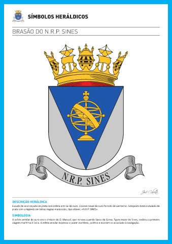 Escudo de azul calçado de prata com esfera armilar de ouro. Coronel naval de ouro forrado de vermelho. Sotoposto listel ondulado de