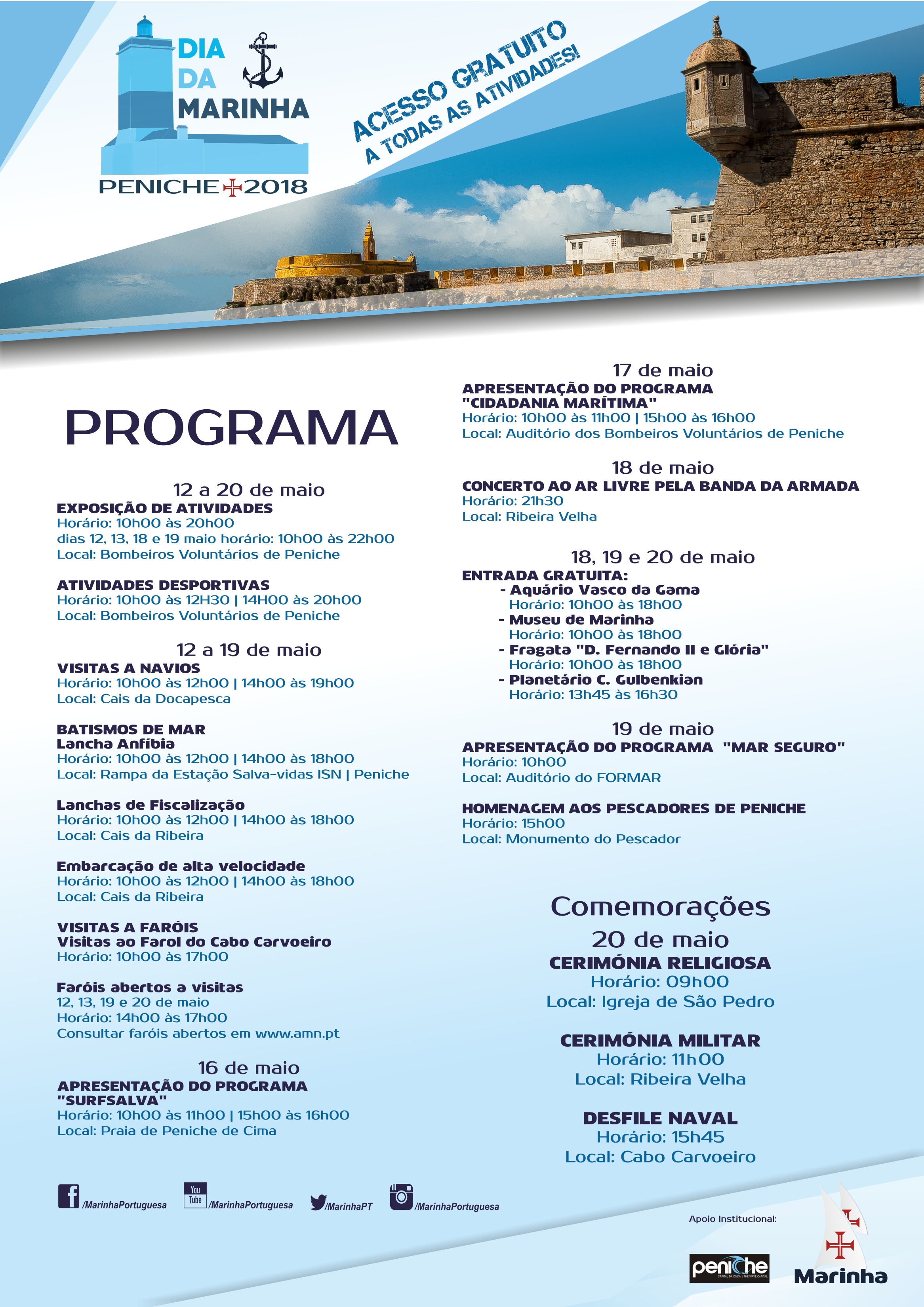De 12 a 20 de maio realizam-se várias atividades gratuitas de interesse para o público em geral, das quais se destacam as exposições temáticas e as atividades desportivas no edifício dos Bombeiros Voluntários de Peniche, concertos da Banda da Armada, navios abertos a visitas, batismos de mar, faróis abertos ao público e, no dia 20 de maio, uma cerimónia militar presidida pelo Ministro da Defesa que decorrerá na zona da Ribeira Velha.
