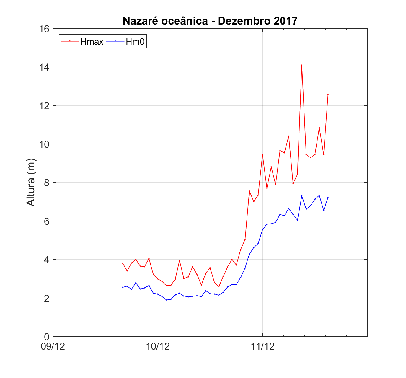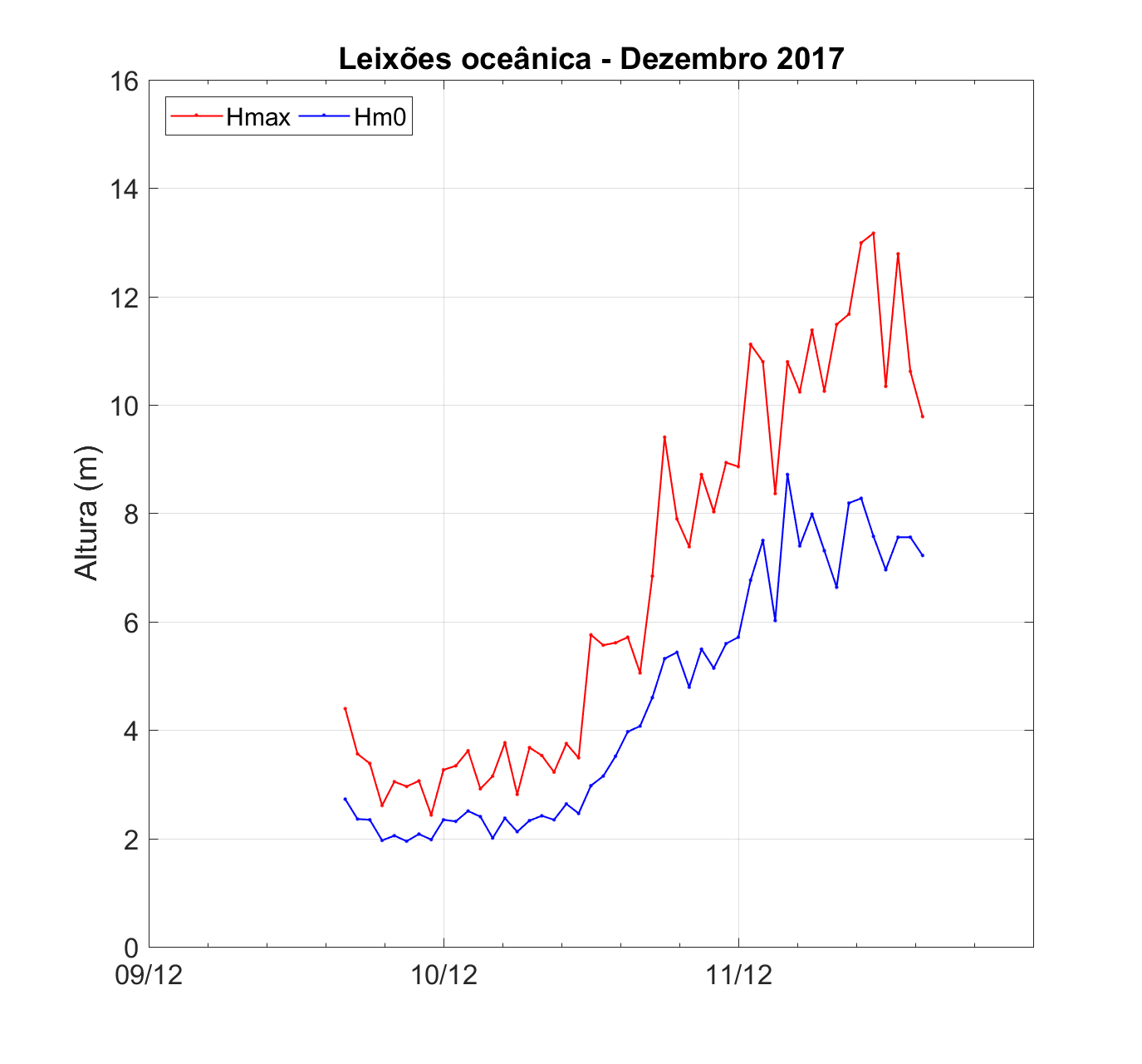 Altura significativa (Hm0) máxima de 7.3 m (13:00 de 17-12-11) e altura máxima (Hmax) de 14.1 m às 09:00 (17-12-11)